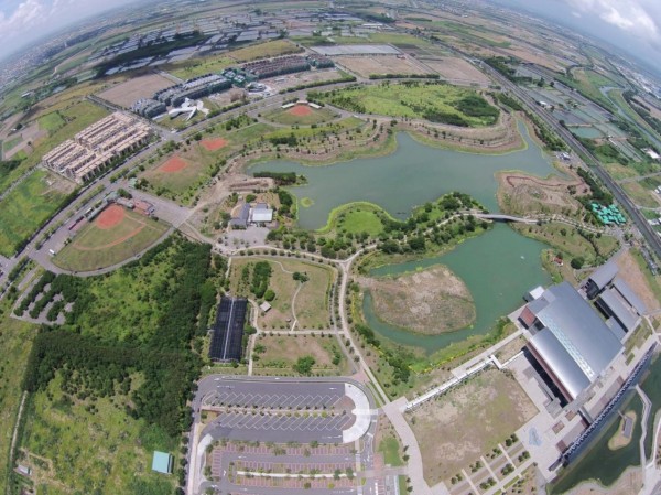 「台南亞太國際棒球訓練中心」基地周邊空照圖,圖右下方建築與滯洪池即為台灣歷史博