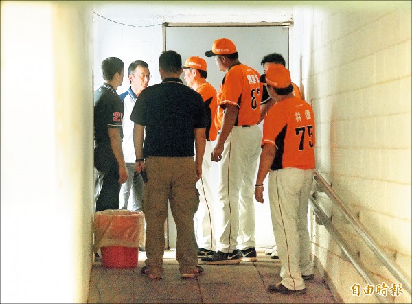 昨晚比賽結束後,統一獅教練團前往裁判室溝通。 (記者方賓照攝)