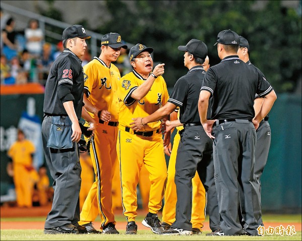 兄弟彭識穎被抓投手犯規,總教練吳復連(左)強烈抗議。(記者方賓照攝)