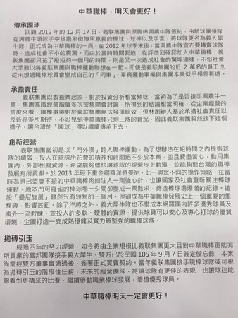 擔社會責任以及各界多所期待,不忍見到中華職棒只剩三隊的窘況,因此義联