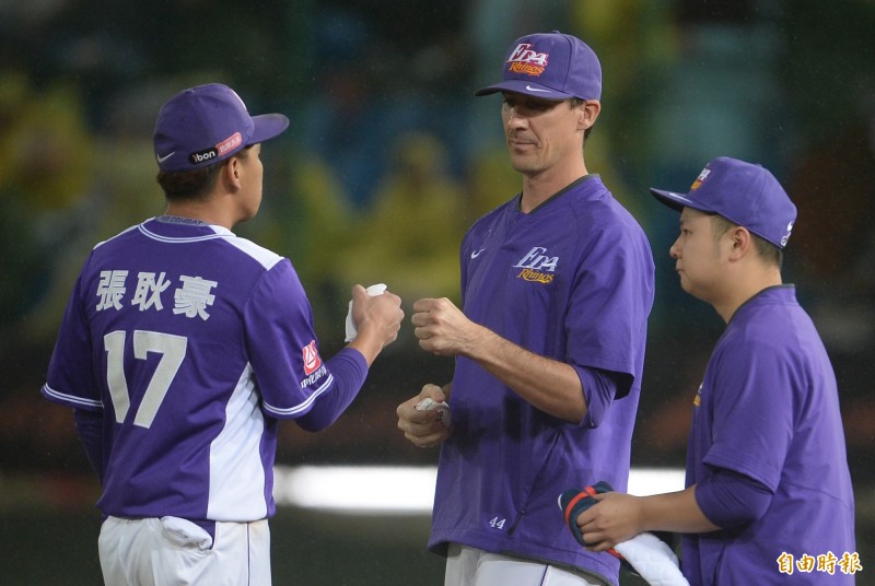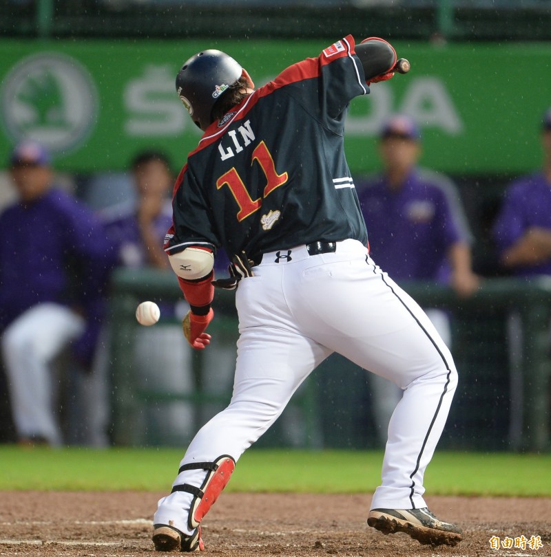林泓育挨觸身球,義大「總教練」張建銘開玩笑地指著胡金龍,說是他下的暗號。(記者
