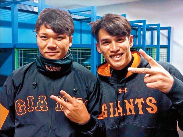 旅日球員陽岱鋼(右)參加巨人隊一軍春訓。圖左為隊友坂本勇人。(取自巨人隊臉書)