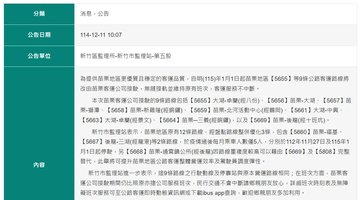,並自115年1月1日起由苗栗客運公司接手代駛。