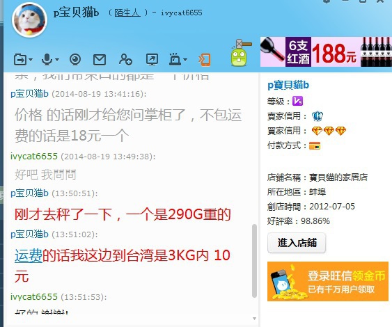 一個290g,賣家直寄台灣 3公斤內10RMB