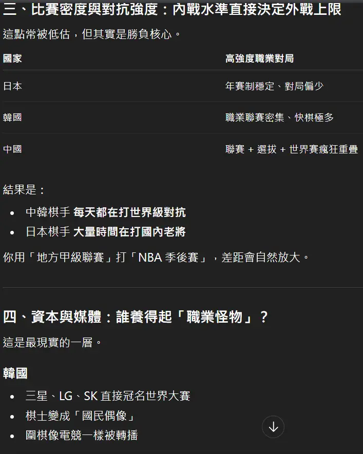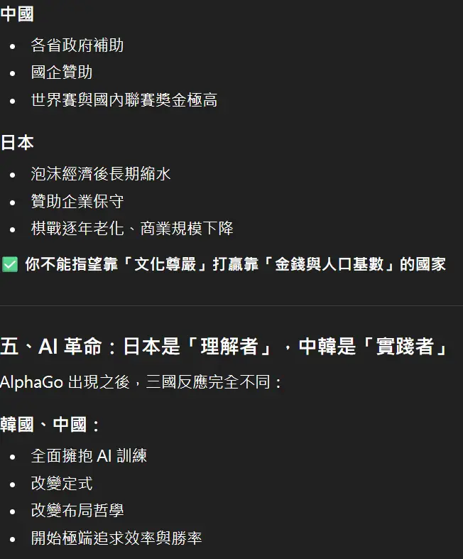 我看過一個說法是日本的賽制太養生了。因為日本是比賽制,每年有保底的對局數,你只不要爛到太誇張你就可以混分。但中韓都是杯賽獎金主導,你只要勝率低對局數就低,獎金就下來了,你的職業也就下不去了。所以只有日本能有那種下到六七十歲,但勝率很差的職業棋手