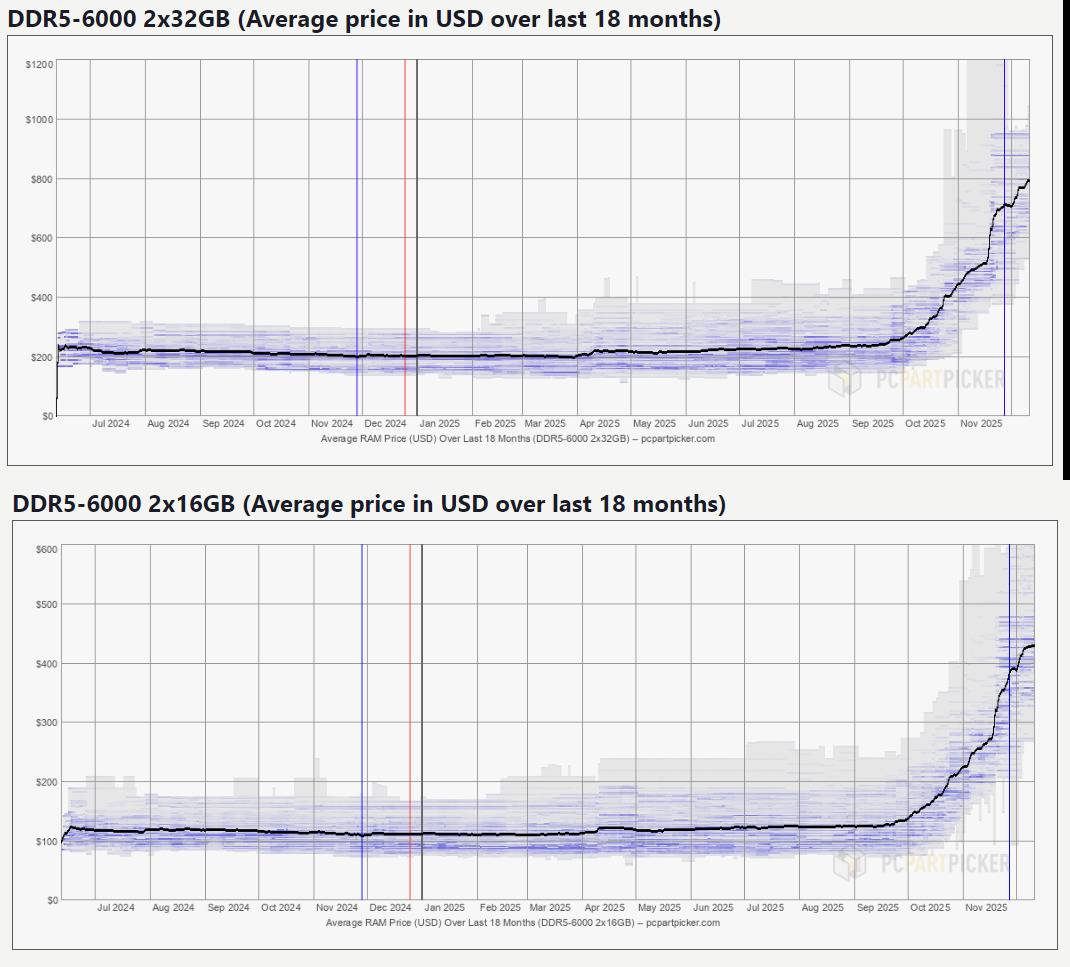2025-12-11 11:22:00RAM先不看特別誇張的高價品 主流的32G雖然漲爛但基本還是落在6000-8000的範圍 算是一般消費者咬咬牙還是能買的程度 而且明年後只會更慘 你現在不組就3-5年不用組了
