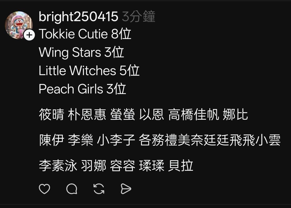 2025-08-22 21:20:00最後一個綠色貌似不是娜比?那就是還沒公佈的說錯 貌似不是玥晨?還是其實就是 XD那小魔女就是公佈的五個全上不知道為什麼公佈到第五個就停了