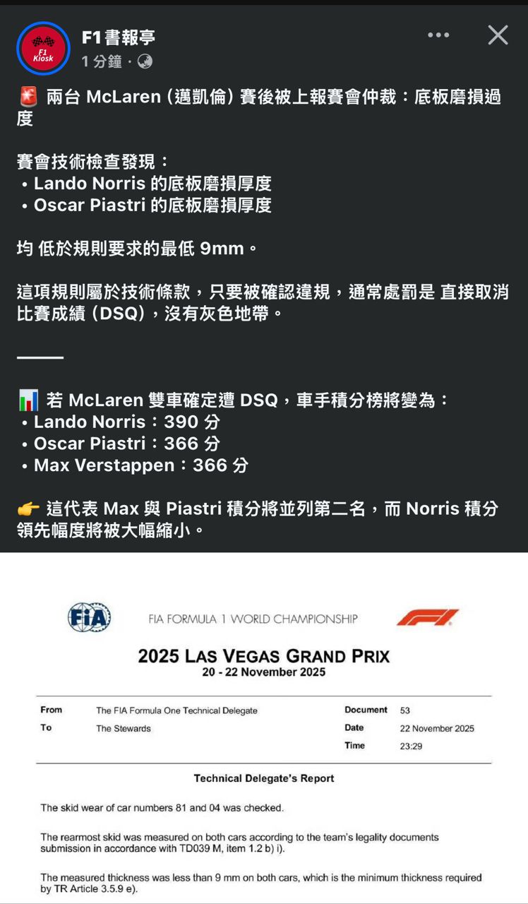 2025-11-23 18:36:00油料問題是SKY提到的,說蘭多被警告油可能不夠最後幾圈要減速,然後這個底板調查是比賽結束後發現的,兩件事是分開的