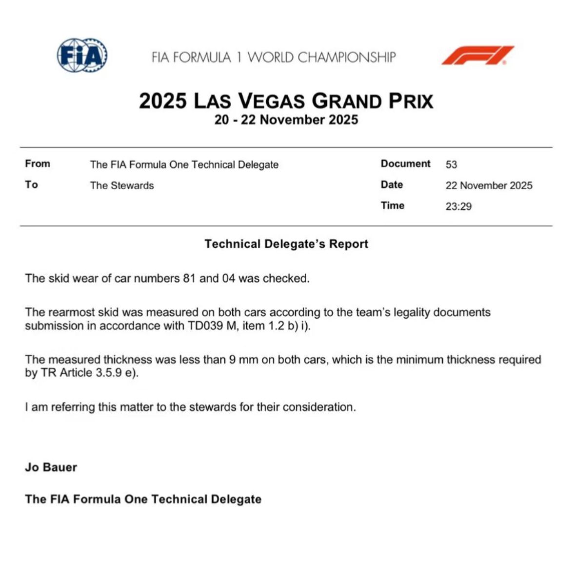 FIA 更正正確數據:Lando的車前底板8.88mm,後底板8.93mm厚。Oscar的車前底板8.96mm,後底板8.74mm厚。規則是要9mm厚。