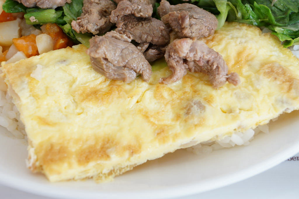 以青菜與鴨肉燴炒過鴨肉直接淋在白飯上,