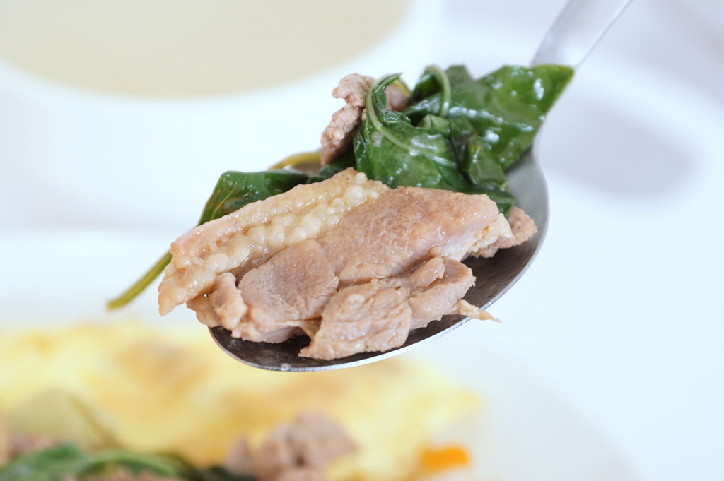餐點最上方的是麻油鴨肉片,底下還墊了大量的青菜在白飯上