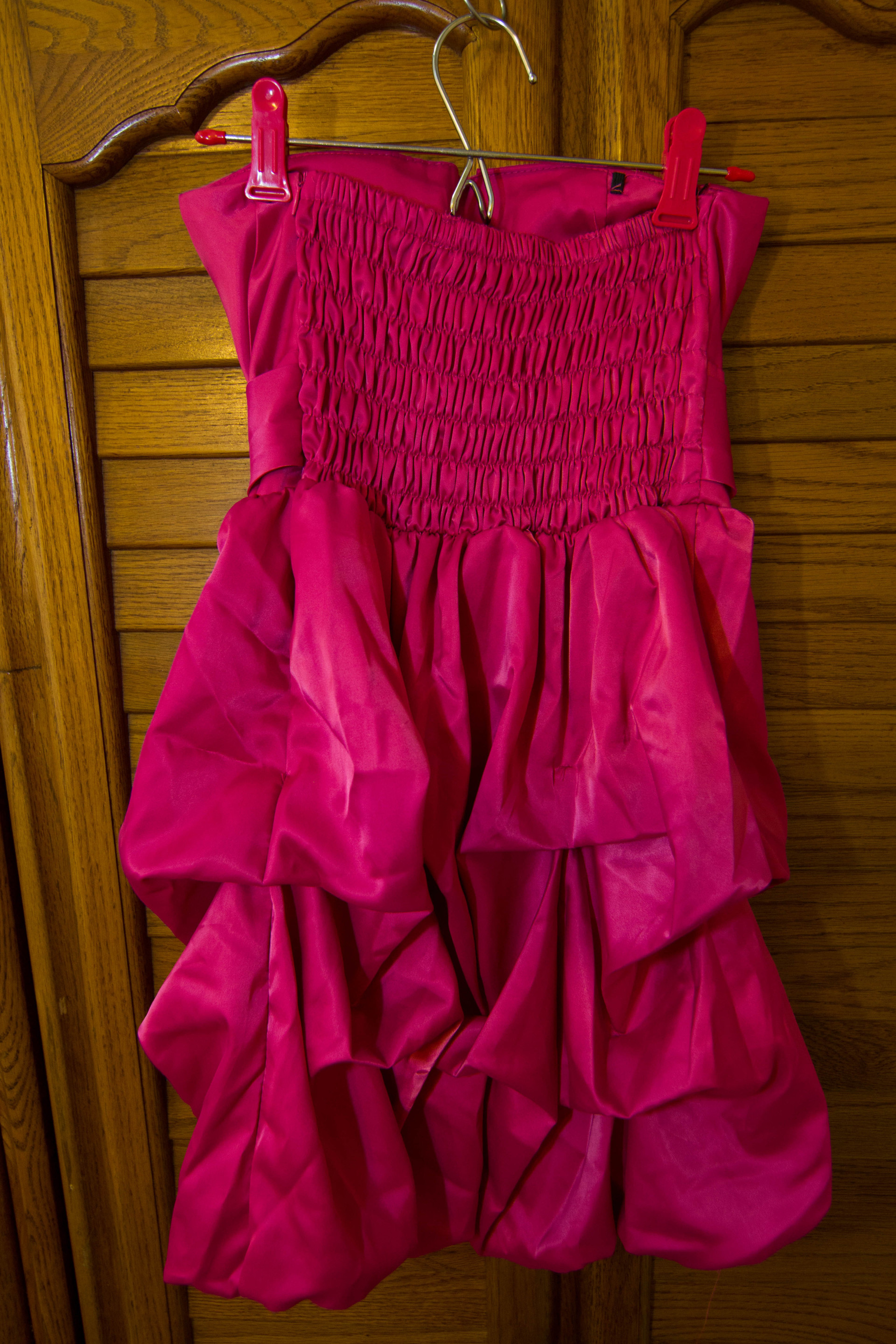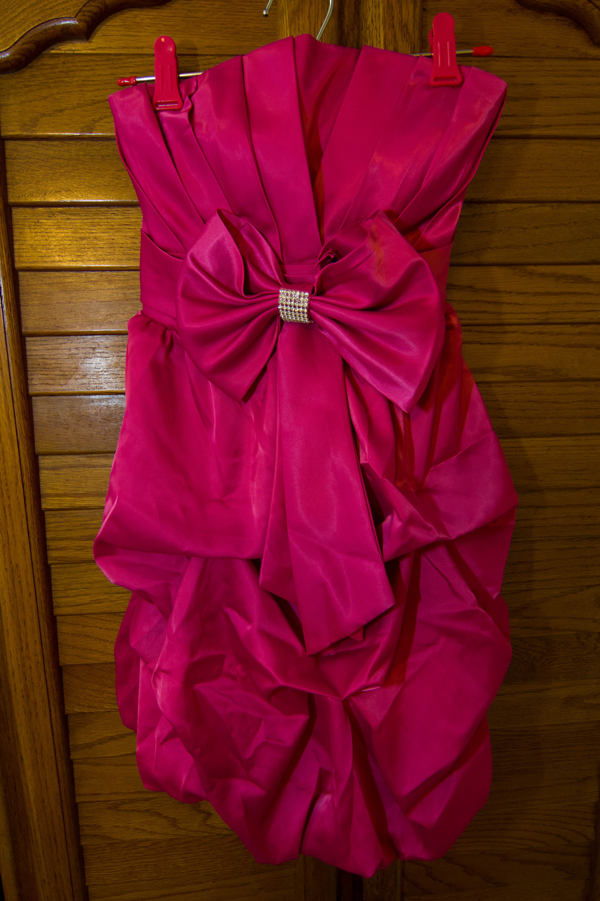 2. 桃紅色緞面露肩短禮服
