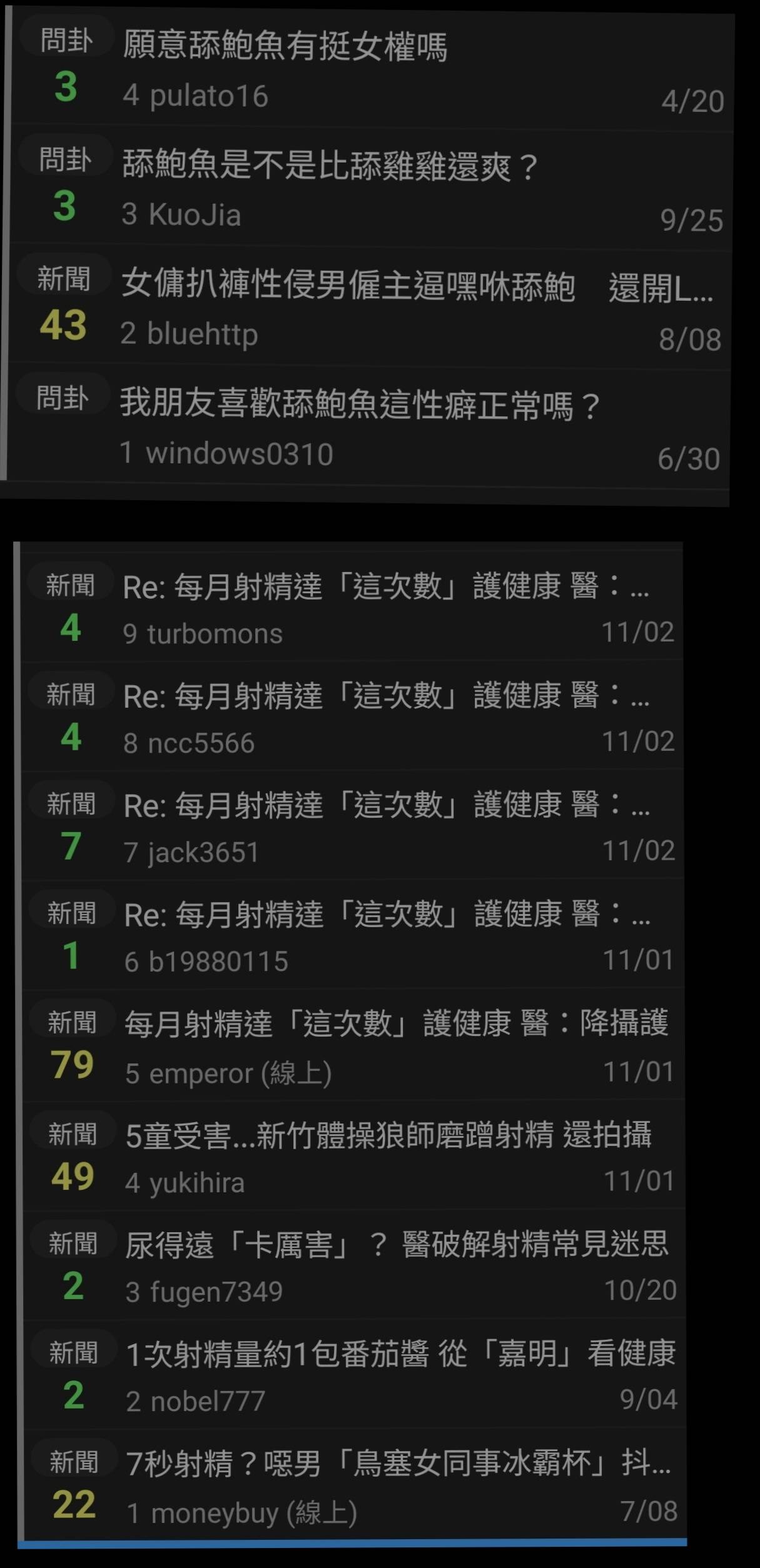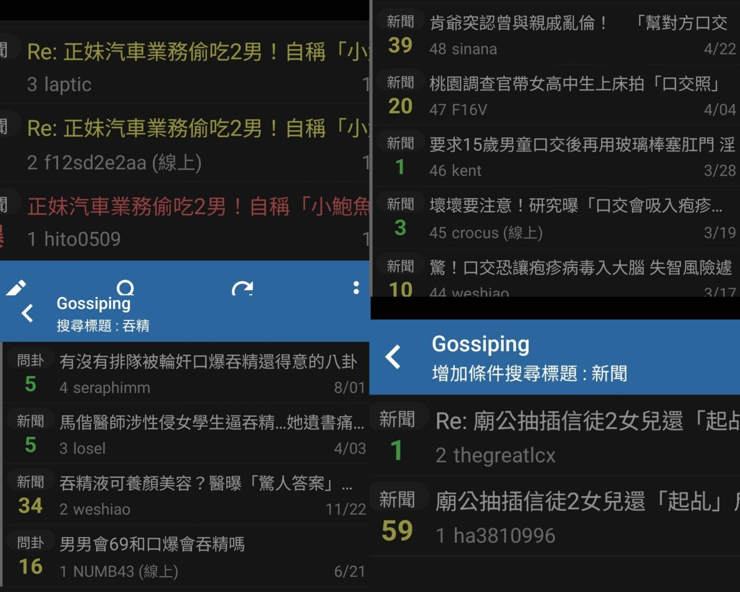 請問這樣依照日常八卦板文章尺度是不是絕大多數都色情色情在八卦板規並未明確定義,但原文主旨意見調查性質如果連提問性行為、學術探討性質的描述到性器官都不行那板上一大堆都達到水桶標準了吧?在是否使人激發性慾的情況下,原文並沒有這種作用一堆新聞如本文舉例截圖用詞標題之色羶腥程度都還更甚