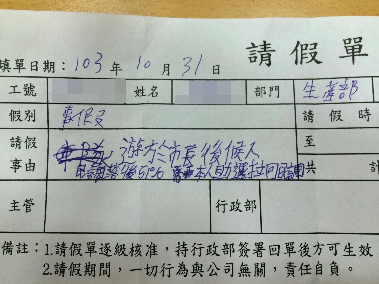 2014-10-31 14:05:00請假投票都是要準的 那是公民義務 不管他要投的是不是對手
