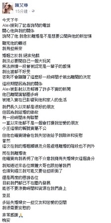 陳艾琳29日在臉書上發文寫道,「Alex接到了記者詢問的電話,關心他與我的關係,詢問