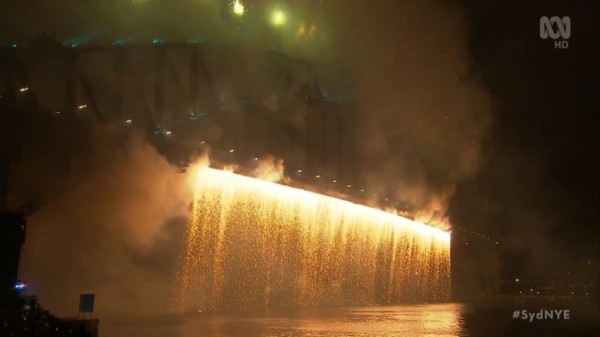 瀑布煙火從雪梨港灣大橋傾瀉而下。(圖擷取自youtube影片)