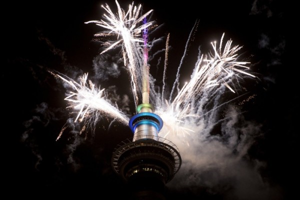 台灣時間19時,紐西蘭奧克蘭市「天空塔」施放跨年煙火,璀璨火花照亮夜空,宣告正式