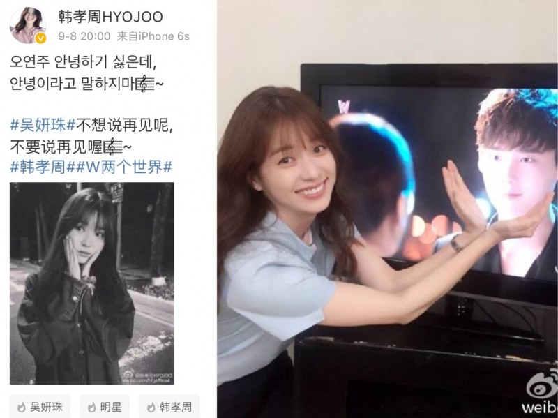 韓劇《W》下周即將播出結局,韓孝珠昨在微博寫下不捨心情。(翻攝自韓孝珠微博)