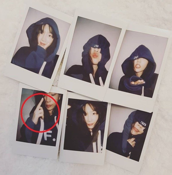 眼尖網友發現,太妍上傳的其中一張照片出現「比中指」的不雅動作。(翻攝自IG)