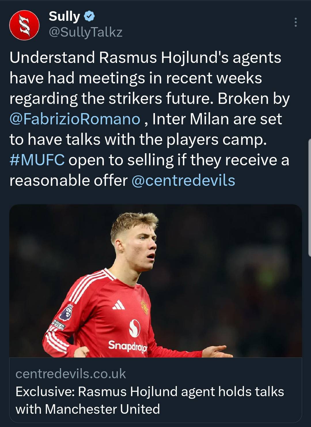 曼聯目前並未積極尋求出售Hojlund,但據了解俱樂部和球員都知道國米的興趣。