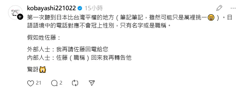 : 有趣的是如果負責該職務的人是男生,很少會聽到「我請我們公司先生回覆你」