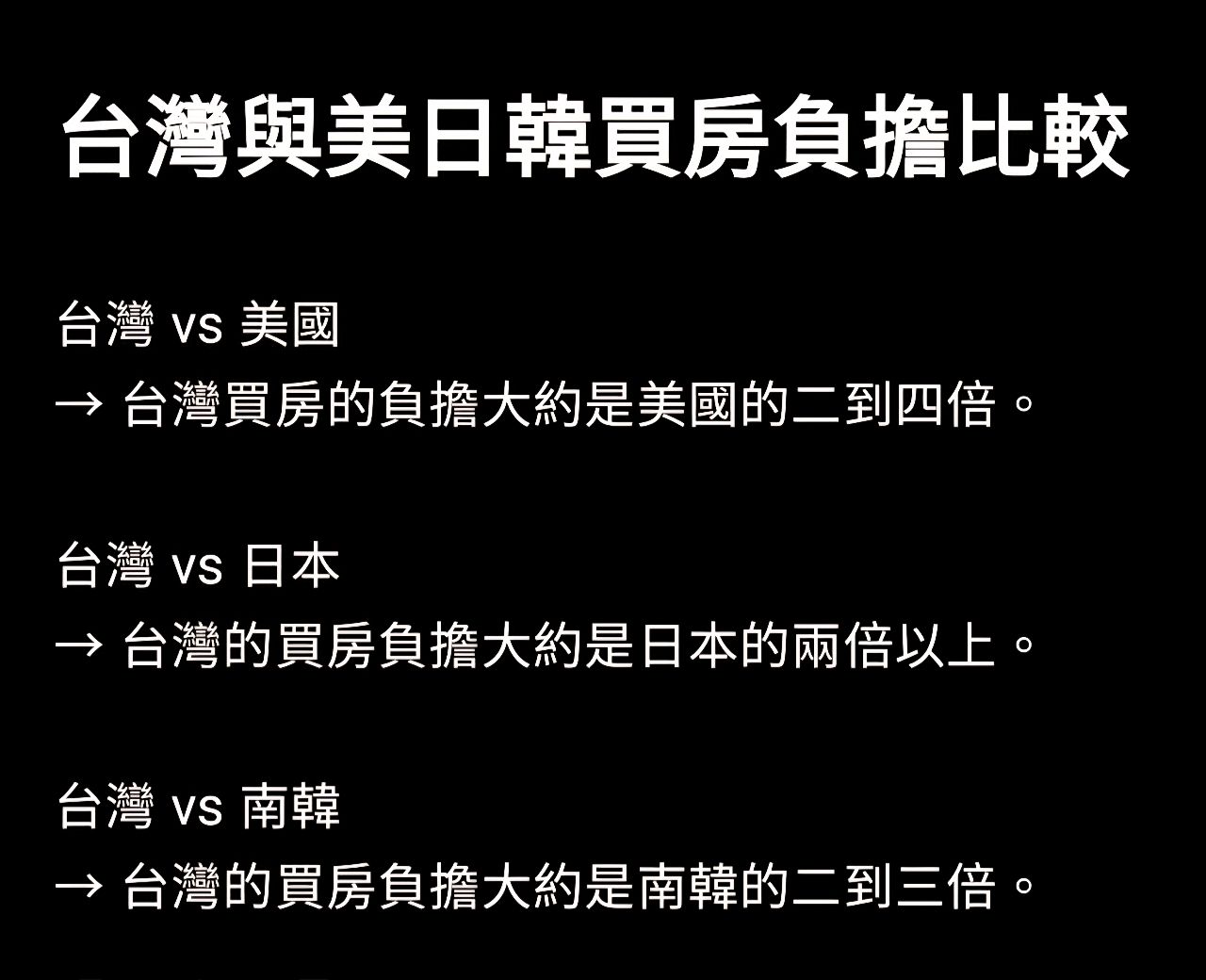 2025-11-20 06:06:00不必偷換概念啦,自己提升薪水後房價跟別國比起來還是貴爆啊,外國人也有高薪族群,人家錢是享受生活,不是賺給炒房仔花,人家房價就是相對合理很多,台灣政府請加油。