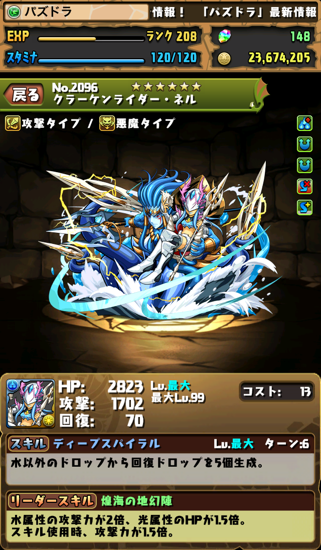 隊長技:水屬性攻擊兩倍,光屬性HP1.5倍,技能使用時攻擊力1.5倍
