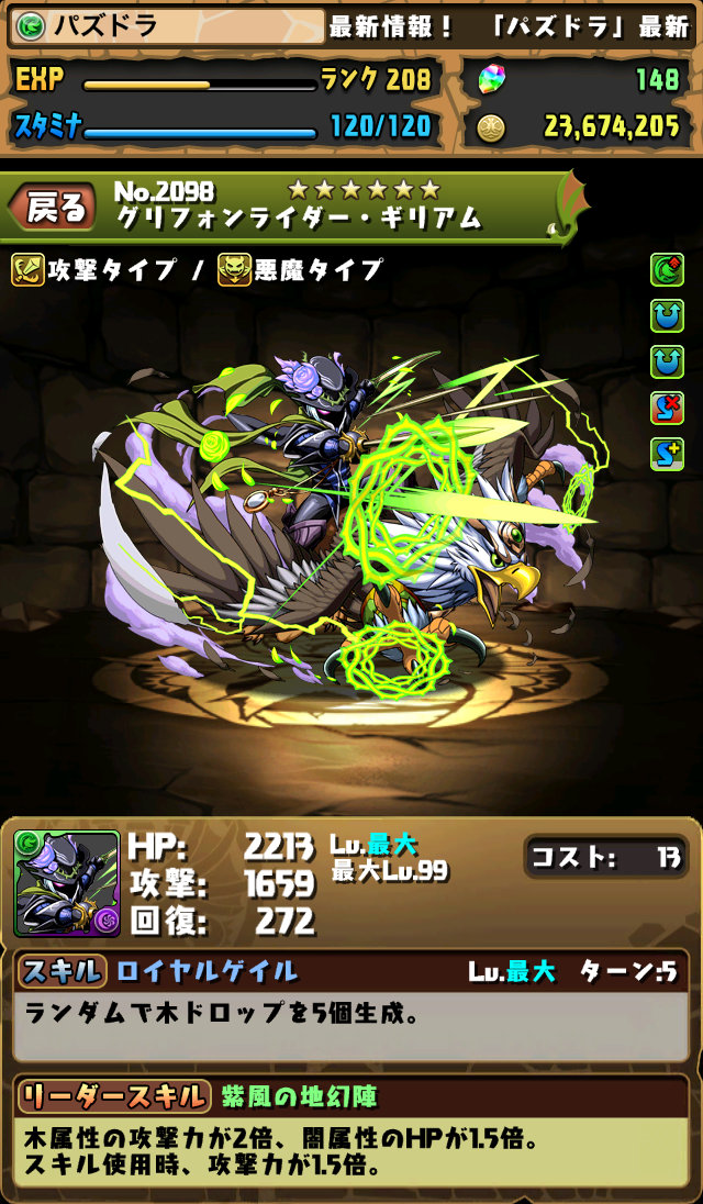 隊長技:木屬性攻擊兩倍,暗屬性HP1.5倍,技能使用時攻擊力1.5倍