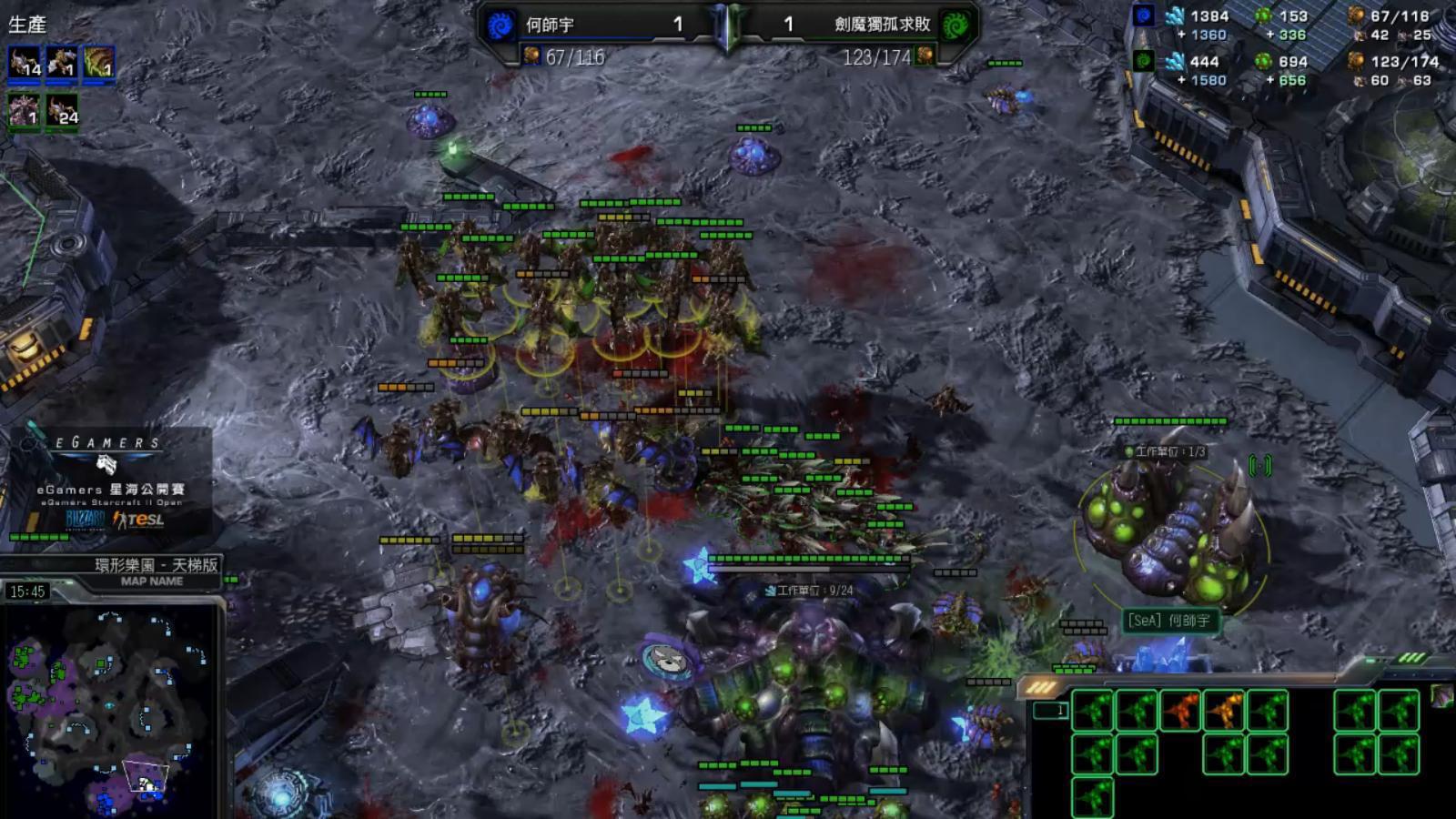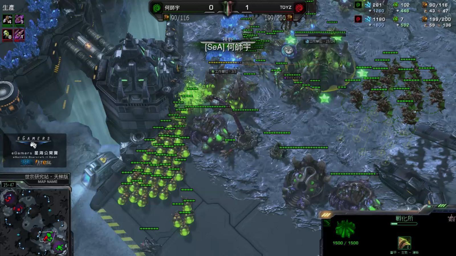 第二輪雙方在世宗研究站進行一場蟲打蟲的對戰,何師宇開局就亮出殺招,先提狗速的速