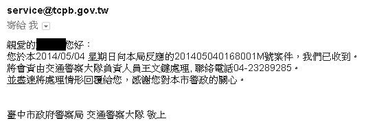 對警政問題的關心,並請隨時對交通、治安提供建言。 臺中市政府警察局敬上 承辦人:交
