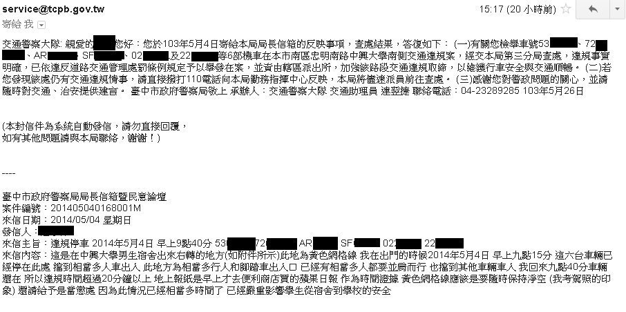 交通警察大隊: 親愛的XX您好:您於103年5月4日寄給本局局長信箱的反映事項,查處結