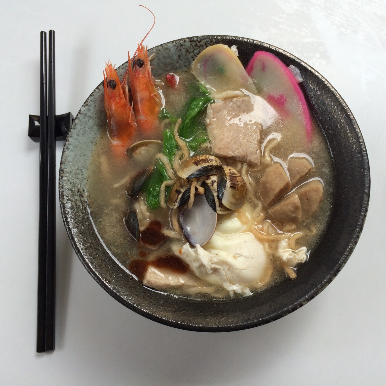 兩隻蝦(半夜特地去安平買最新鮮的)、蛋、五顆蛤犡、