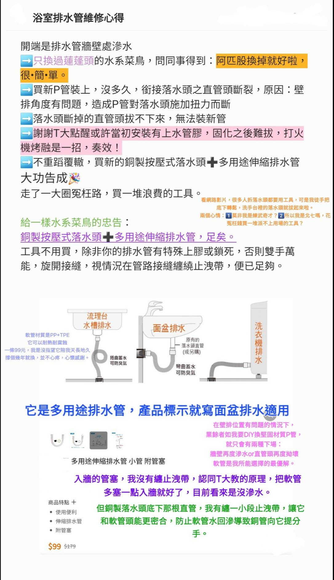2025-10-14 17:09:00呃,e大,這是浴室洗手台排水管,不會共接到頂樓洗衣機排水系統,會買多用途軟管也是不得已,畢竟上一條新P管ㄍㄧㄥ斷落水頭下來那條直管,謝謝您的建議。然後,很遺憾這浴室從來不曾讓我有水太大太熱這種奢侈煩惱......(哭著跑走