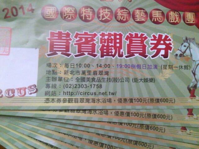 物 品:2014太平洋翡翠灣鉅大國際大馬戲團優惠票10張