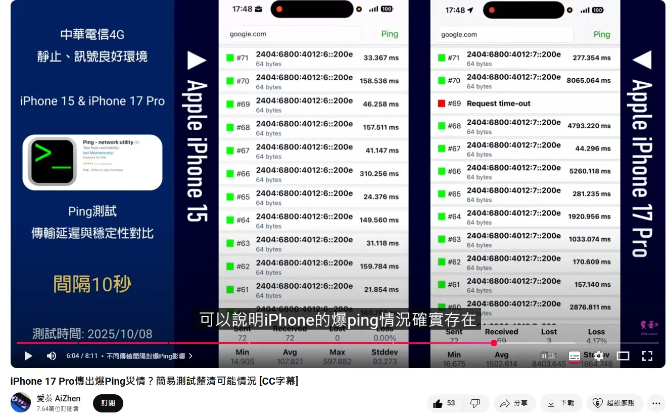 像AiZhen 這位專門在測電信訊號的yter也沒出來講他也換了17PRO 也沒出來講說有爆PING?