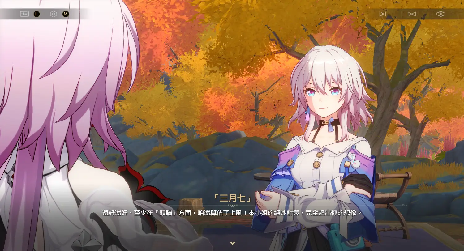 長夜月這兩句話的中文都是「你」,其實對象不是很明確但如果看日文,第一句就指名道姓那個「你」是指三月七所以這兩句話其實是她在對自己說「像三月七那樣與人相處,我果然還是辦不到啊…」「但是,為了讓那孩子(三月七)能追尋未來、繼續這令人快樂的旅程…」因此這句應該不是在嗆丹恆,但很記仇是真的XD題外話 3.0很多詞藻華麗的文本,有時真的很難看懂,也許是我中文造詣不夠吧所以我都看中文字幕聽日文,看不懂的時候用聽的反而很簡單明瞭
